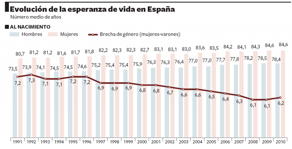 Evolución de la esperanza de vida en España, por sexos, entre 1991 y 2010. Fuente: El País, 2 de marzo de 2012, con datos del INE.