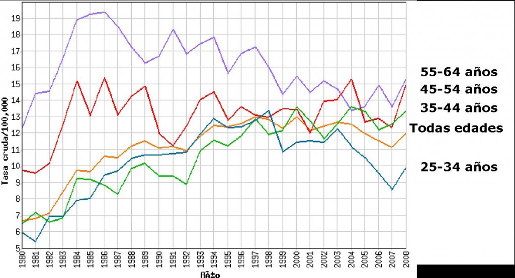 Los datos más recientes de suicidio disponibles son de 2008, reflejándose un repunte importante en el marco de una tendencia descendente desde 1997. En la grafica siguiente podéis ver la evolución de las tasas de suicidios en hombres en edades laborales (25 a 64 años), reflejándose que el grupo que ha sufrido un mayor aumento en la tasa (2 puntos y medio más) es el de 45 a 54 años.