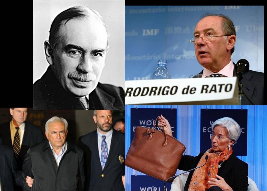 Cuatro ilustres protagonistas (algunos, muy “mediáticos”) en la vida del FMI: Fila de arriba: a la izquierda, John Maynard Keynes (uno de los principales arquitectos del FMI); a la derecha, Rodrigo Rato (presidente del FMI de 2004 a 2007). Fila de abajo: a la izquierda, Dominique Strauss-Kahn (presidente del FMI de 2007 a 2011), detenido en Nueva York; a la derecha, Christiane Lagarde (presidenta desde mayo 2011), mostrando su bolso vacio para indicar la necesidad de recaudar fondos. para el FMI