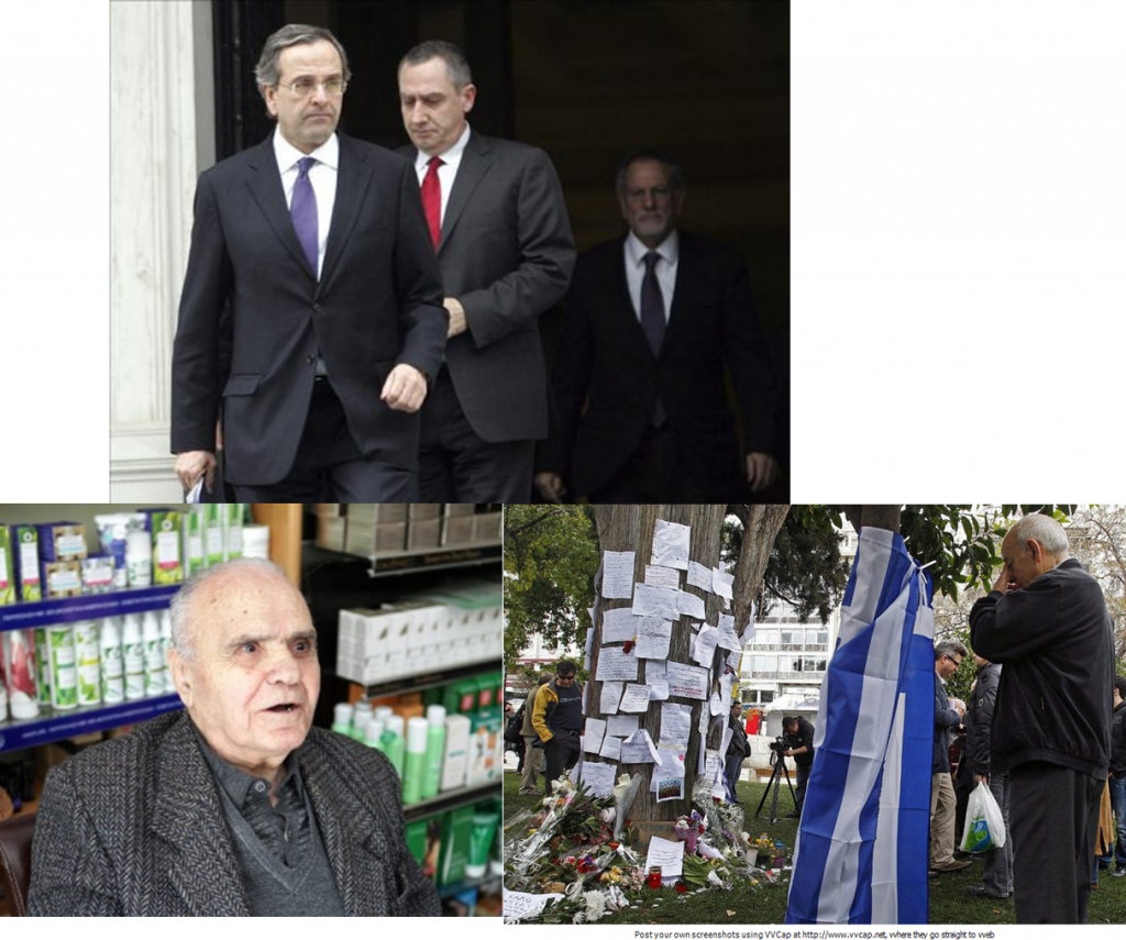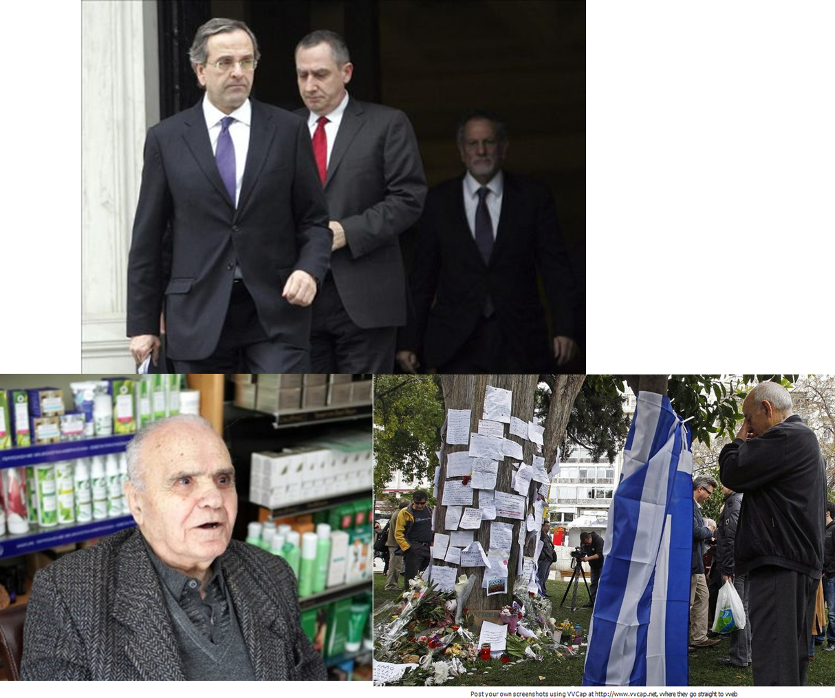 Foto de arriba: Reunión de la Troika (FMI-BCE-CE) con el gobierno griego que dirige el exbanquero Lukás Papadimos en febrero de 2012 (fuente: http://actualidad.orange.es). Foto abajo derecha: Luto por el suicidio del farmacéutico jubilado Dimitris Christoulas en la plaza Syntagma de Atenas. (Fuente: http://www.cabiados.net/). Foto de abajo izquierda: Retrato de Dimitris Christoulas. (Fuente: http://desinformemonos.org/2012/04/no-encuentro-otra-solucion-que-una-muerte-digna/)