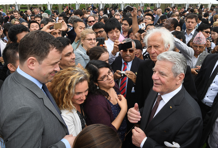 La ceremonia de entrega fue parte del evento anual de la Fundación Alexander von Humboldt, que tuvo lugar en Berlín los días 6 a 8 de julio, 2016. Aquí varios asistentes posan junto al Presidente de la República Federal de Alemania, Joachim Gauck (figura central).