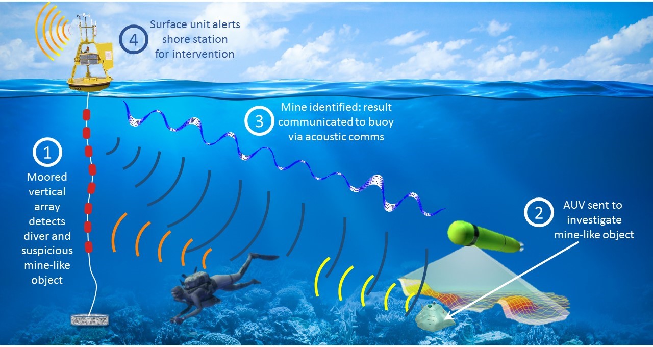 «Teniendo en cuenta los desafíos y oportunidades que se presentan, creemos que una solución adecuada es aplicar la detección acústica para la identificación de un buceador y una combinación de detección acústica y basada en imágenes para revelar una mina sumergida», explican los co-directores del proyecto Roee Diamant (Universidad de Haifa) y Lutz Lampe (Universidad de Columbia Británica). «En este último caso, el procesamiento de la señal acústica proporciona detección y localización de los objetivos, y los datos de imágenes se obtienen enviando un AUV a una distancia segura de la mina sospechosa, para inspeccionar el objeto usando cámaras ópticas o imagen de sonar. Esto sirve para verificar lo que se ha detectado. La comunicación con el AUV se basa en señales acústicas bajo el agua. De esta manera, el sistema puede enviar al AUV las coordenadas aproximadas del objetivo, y puede recibir de vuelta la imagen de destino ya procesada. »
