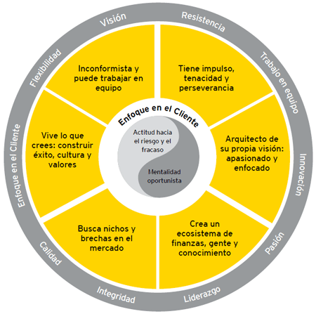 Paralelamente también este estudio señala que los emprendedores comparten características en común. Así, puede ser cierto, que los emprendedores no nacen. Sin embargo, la investigación arrojó que los emprendedores generalmente muestran una combinación común de comportamientos y actitudes. En la parte central de este modelo se encuentra un fuerte control interno; es decir, una creencia de que los sucesos son el resultado directo de las acciones o comportamientos propios de una persona. Esto se complementa por una mentalidad que ve oportunidades donde otros ven problemas, junto con una aceptación de un riesgo calculado y tolerancia al fracaso.