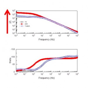 Mediante técnicas avanzadas de caracterización electroquímica como la Espectroscopia de Impedancia Electroquímica (EIS) y la Espectroscopia de Impedancia Electroquímica Localizada (LEIS) se caracterizaron los recubrimientos sol-gel modificados para evaluar su capacidad inhibidora en los procesos electroquímicos. Se observó que la adición de diferentes grupos funcionales aportados por los inhibidores entrecruzó el sol-gel de forma más efectiva, formado una red tridimensional más resistente, aportando resistencias crecientes a tiempos cortos sobre muestras sin defectos (Fig.1) y una disminución atenuada de la resistencia de polarización final en muestras con defectos controlados (Fig.2).
