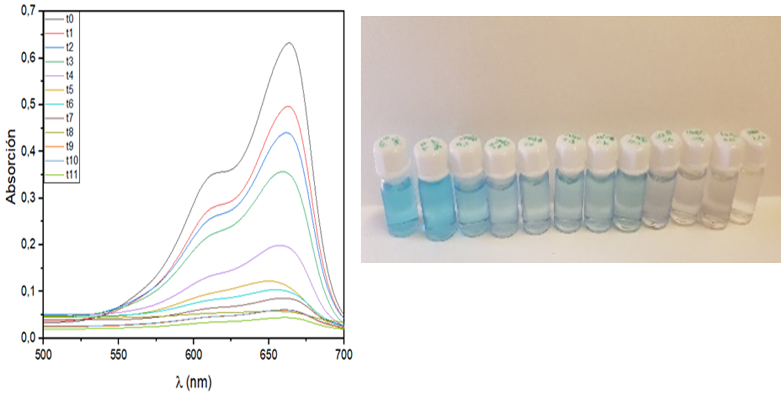 Como es conocido, diferentes colorantes sintéticos e industriales provocan problemas ambientales graves debido a su toxicidad, estabilidad y alta resistencia frente a la degradación aeróbica. En este contexto, el colorante orgánico azul de metileno catiónico se considera como una forma de contaminante en disoluciones acuosas. Por ello, empleando las nanoestructuras híbridas de γ-Fe2O3-ZnO bajo irradiación de luz UV-vis se evalúa la degradación fotocatalítica de dicho contaminante. Además, una revisión de la literatura muestra que, para conseguir una degradación del contaminante más eficaz, se requiere no sólo un diseño del compuesto semiconductor acoplado sobre las estructuras de banda de sus componentes; sino también otros parámetros diferentes tales como la cristalinidad, el tamaño de partícula, la distribución y el contenido de carga de los componentes activos. También se ha estudiado la posibilidad de reutilizar los sistemas híbridos γ-Fe2O3-ZnO, separándolos del medio magnéticamente para, a continuación, volver a emplearlos como fotocatalizadores hasta tres veces consecutivas en reacciones independientes.