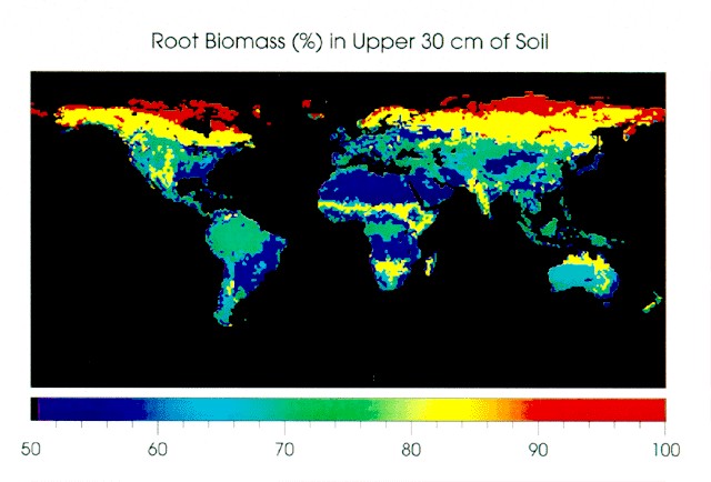 Donde g es la proporción de las raíces desde la superficie a la profundidad d. Cuando más aumenta la proporción de raíces en profundidad, mayor es el valor de b, que varía desde 0.913 en sistemas de tundra hasta 0,976 en desiertos y bosques templados de coníferas. Para herbáceas el promedio es 0,952 (…) para los arbustos 0,978 (…) y para los árboles 0,90. (…) Al nivel mundial, el promedio da 0,966, con: