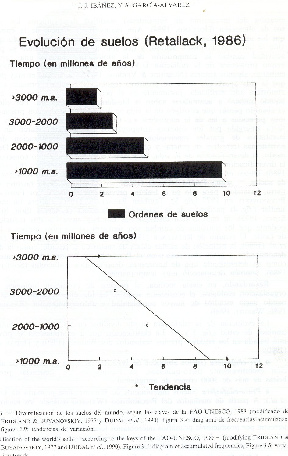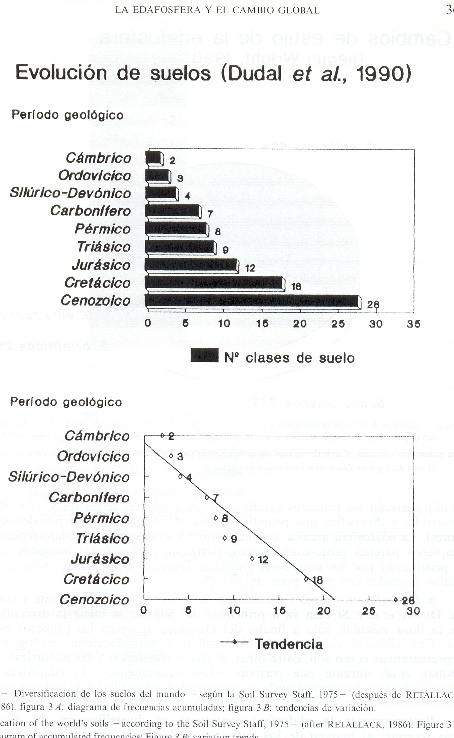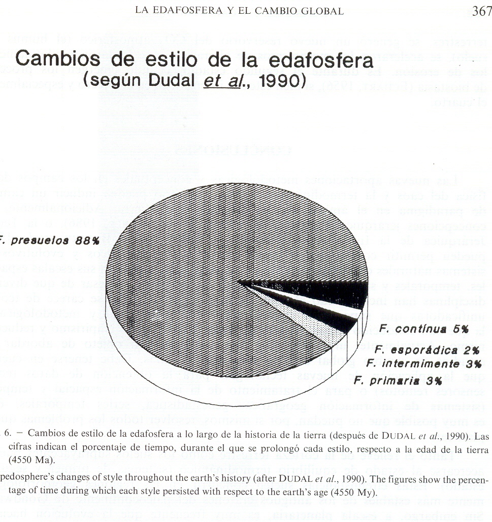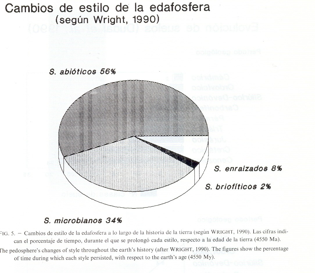 El suelo, tanto desde el punto de vista edafogenético como desde el ecológico, también ha ido modificando sus características estructurales y funcionales. Prácticamente, todos los «cambios de estilo» actualmente reconocidos, tienen su origen en otros tantos surgidos en la evolución de la vida. Así, por ejemplo, el proceso que inició la formación de una atmósfera oxidante (mediante la creación del mecanismo de fotosíntesis) modificó drásticamente los procesos de alteración (HOLLAND, 1984). Aún no existe constancia consensuada del momento exacto en que los microorganismos colonizaron el suelo. Generalmente es asumido que la vida se inició en un medio acuoso, y que sólo lo abandonó cuando su propia actividad cambió la composición de la atmósfera, creando una capa de ozono protectora de la radiación U.V. (hace aproximadamente 550 m.a.). Sin embargo, algunos autores (NUSSINOV & VEKHOV,1978) opinan que es muy posible que la vida apareciera sobre un primitivo regolito (R-regolito) formado en una atmósfera aún rarificada, justamente en el períodoen el que el agua en estado líquido empezó a acumularse sobre la litosfera, hace 4.000 m.a. Por ello, no es absurdo pensar que el origen de la vida se diera en un medio con propiedades muy parecidas a las de la edafosfera s.s. Con posterioridad, la invasión de la tierra emergida por los sistemas autopoyéticos pluricelulares marcó un salto cualitativo de grandes repercusiones: comenzó la autoorganización de los ecosistemas terrestres en general y del ecosistema edáfico en particular. De este modo, la diversificación de la vida, en y sobre el suelo, tuvo como consecuencia la diversificación de los tipos de suelos y de los rasgos edafogenéticos (RETALLACK, 1986). DUDAL et al. (1990), describen el proceso de emergencia de los distintos tipos de suelos según la clasificación de la FAO-UNESCO (1988), a lo largo de la historia de la tierra, basándose para ello en el trabajo previamente realizado por FRINLAND y BUYANOVSIY en 1977. También RETALLACK (1986), elaboró un modelo similar partiendo de la taxonomía americana de suelos (SOIL SURVEY STAFF, 1975). Si bien existen discrepancias notables entre los dos modelos, es evidente que los patrones de cambio son similares, ajustándose ambos a la denominada ley de Dollo. El estudio de RETALLACK (1986) recoge, al contrario que el de DUDAL y colaboradores (1990), la extinción de ciertas clases de suelos en el pasado, como la de los denominados «green clay soils» en el precámbrico. WRIGHT (1990) contempla como un determinado tipo de horizontes, denominados fosfocretas (SOUTHGATE, 1986), también desapareció muy tempranamente.