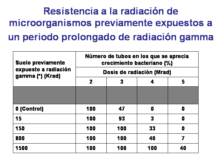 Los microorganismos, en general, tienen alguna tolerancia o resistencia a las radiaciones ionizantes. Este tipo de radiaciones han sido ensayadas como método de esterilización de alimentos, agua y suelos, por lo que se dispone de una amplia información sobre sus efectos.