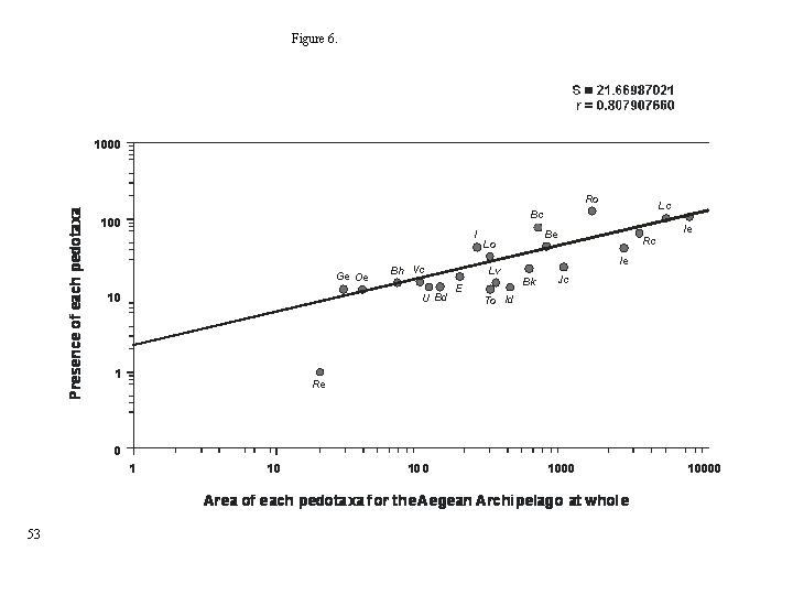 En donde R es el rango geográfico del número de islas en las cuales un edafotaxa concreto está presente y A la extensión superficial relativa que ocupa el mismo respecto a los restantes encontrados en la zona de estudio. No hemos detectado en la literatura discusiones acerca de los exponentes, por lo que asumimos que los valores de estas dos constantes podrían variar, al contrario que en las SPARs. Muy pocos taxa se encuentran ampliamente distribuidos mientras que abundan los restringidos a regiones geográficas concretas, como e muestra en la siguiente figura (una mejor calidad de la imágen en «Galería Diversidad»).