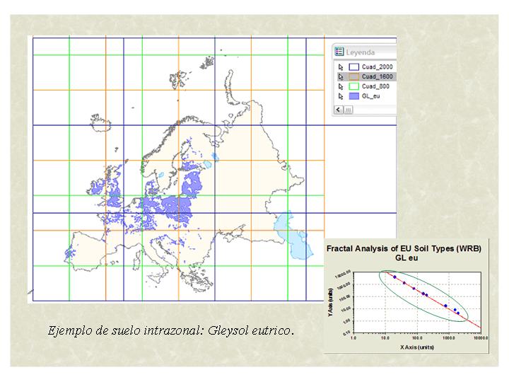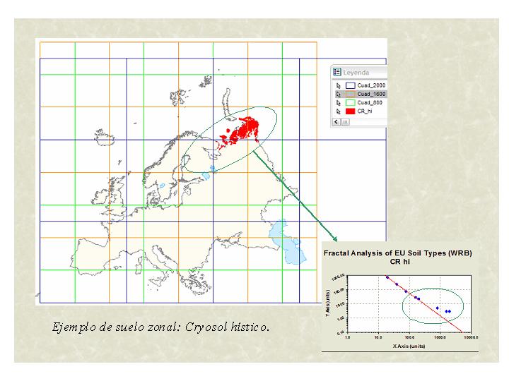 Por su parte, Ibáñez y colaboradores en un estudio (aun no publicado) desarrollaron una metodología que no se basa en asunciones teóricas, sino en un mero análisis cuantitativo de los datos, para lo cual hacen uso de herramientas matemáticas de fácil aprendizaje, como lo es el análisis fractal, mediante el método de las cuadriculas. Con tal motivo, haciendo uso de sistemas de información geográfica, analizaron la base de datos digital de los suelos de Europa. Sucintamente, se trata de fragmentar tal información en cuadrículas de tamaños crecientes (desde los 20 a los 2000 km2) y ver si los datos se ajustan a una ley potencial. Al trabajar con tres órdenes de magnitud, se consigue tal ajuste podemos decir que la distribución espacial de un edafotaxa es fractal.