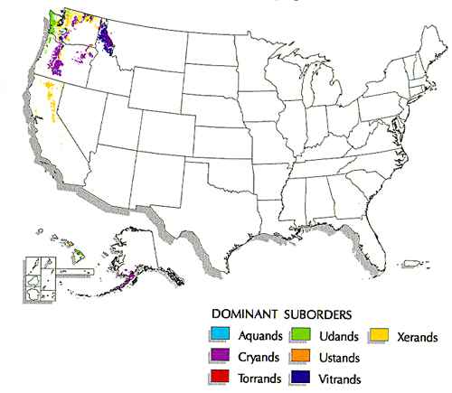 En un contexto Europeo, un taxon zonal no puede considerarse endémico (ya hemos mentado la relatividad del concepto), pero sí los intrazonales como lo es el Gleysol eútrico. Se aplico tal metodología a los 70 tipos de suelos más abundantes en Europa, lo que nos impide mostrar una gráfica de tal situación. Sin embargo todos los analizados se ajustaban a los patrones mentados, por lo que sólidamente llegamos a las conclusiones que aquí exponemos. Exponemos pues el caso de varios tipos de Andisoles en USA (usando la USDA-Soil Taxonomy). Como se puede observar, ya a nivel de suborden, ciertos taxa pueden considerarse endémicos.