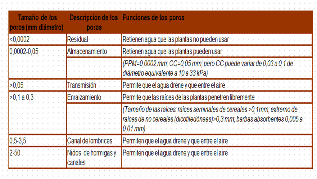 La información que exponemos la hemos obtenido de una tabla (“Funciones y tamaños de los Poros del Suelo”) que aparece en un texto que se puede bajar libremente de Internet. Se trata de la tabla 6 del citado documento. Advertimos que este post contiene contenidos muy básicos y esta dirigido a los estudiantes.