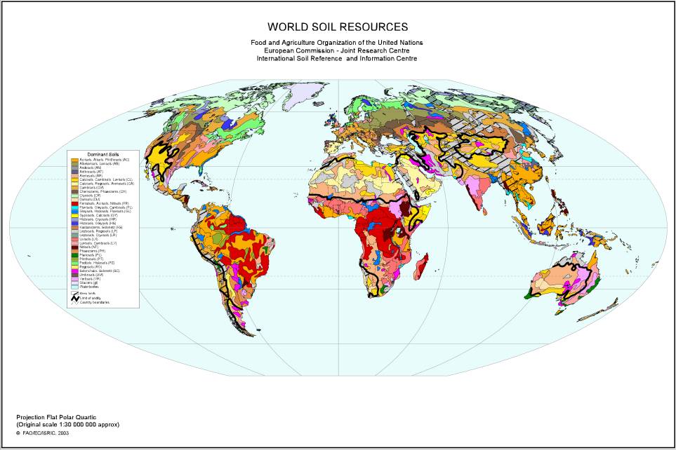 Como ya sabéis mucho de vosotros, el Mapa de los Suelos del Mundo de la FAO fue realizada a la escala 1:4.500.000 millones. En otras palabras, se trata de una resolución muy grosera, empero es la única existente harmonizada a nivel mundial. Por tanto, aquellos navegantes que dispongan de mapas más detallados y actualizados de su país deben confiar más en esta que en la que aquí vamos a proporcionar. Sin embargo, con vistas a realizar comparaciones entre la composición de la edafosfera de los distintos países, la documentación que os ofreceremos es la mejor disponible. Del mismo modo es más que suficiente con fines didácticos. Ya os ofrecimos en otro post, el enlace de una iniciativa conjunta FAO (ISRIC)-Buró Europeo de Suelos de donde se pueden bajar libremente los mapas de suelos compilados a lo largo de muchos años por esta institución. Por tanto, también se pueden obtener y cotejar tales cartografías y la susodicha base de datos. Mediante este modo de proceder podréis llegar (al menos los más instruidos) a obtener un conocimiento aproximado de la distribución espacial de los suelos en las regiones de cada uno de los Estados aludidos.