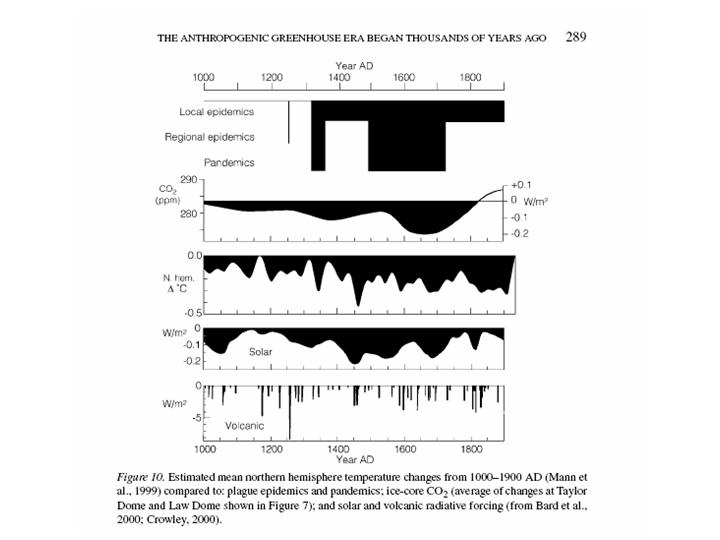 Intentaba continuar escribiendo sobre el Antropoceno, cuando al leer el artículo de Wikipedia al respecto, me topé con una réplica de William F. Ruddiman, paleoclimatólogo retirado de la Universidad de Virginia, que podéis leer en este artículo. Me ha parecido un documento interesante que ya analizaremos en otro post. Entre otras cuestiones, el amigo Guillermo defiende que los descensos acaecidos en las temperaturas medias del planeta a lo largo del neolítico obedecen a los efectos colaterales de las grandes pandemias que ha azotaron a la humanidad ¡Sorpresa! ¿Falso o cierto?: ¡Y yo que sé! En cualquier caso, no cabe duda de que se trata de una vinculación sorprendente. Os recomiendo que leáis el artículo aludido, ya que no tiene desperdicio. Durante los últimos años nos han apabullado con noticias de prensa que auguran futuras epidemias causadas por el calentamiento de la atmósfera. Ahora Guille intenta convencernos que de ocurrir una gran mortandad, podrían descender las emisiones de CO2 a la atmósfera, y como corolario ayudar a frenar el efecto de invernadero antropogénicamente inducido. Vamos, que si se entera Bush (…..) estamos perdidos (con atesorar una vacuna para la población de EE.UU. iríamos todos servidos). Realmente la hipótesis que defiende Ruddiman se basa en que dice haber encontrado una correlación (una relación causa-efecto, ya es otra cuestión) entre las mentadas pandemias (como la peste bubónica) y el clima de la tierra durante los últimos miles de años. ¿Cual es la razón? Analicémosla.