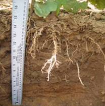 Use una pala o espátula y haga una excavación cuidadosa alrededor de una planta seleccionada, preferiblemente una hierba que no sea importante. Una vez que se llegue a la profundidad máxima de la raíz, busque raíces finas con una apariencia blanca, que es síntoma de su salud. Raíces pulposas y/o oscuras indican problemas serios de drenaje y una pobre expectativa de la cosecha del año. La limitación de desarrollo de raíces quizás indique también la existencia de enfermedades o la presencia de plagas en los sistemas radiculares. Cuando usted mira a las raíces, puede realmente saber que debe esperar de las plantas, dice Raymond Allmaras.