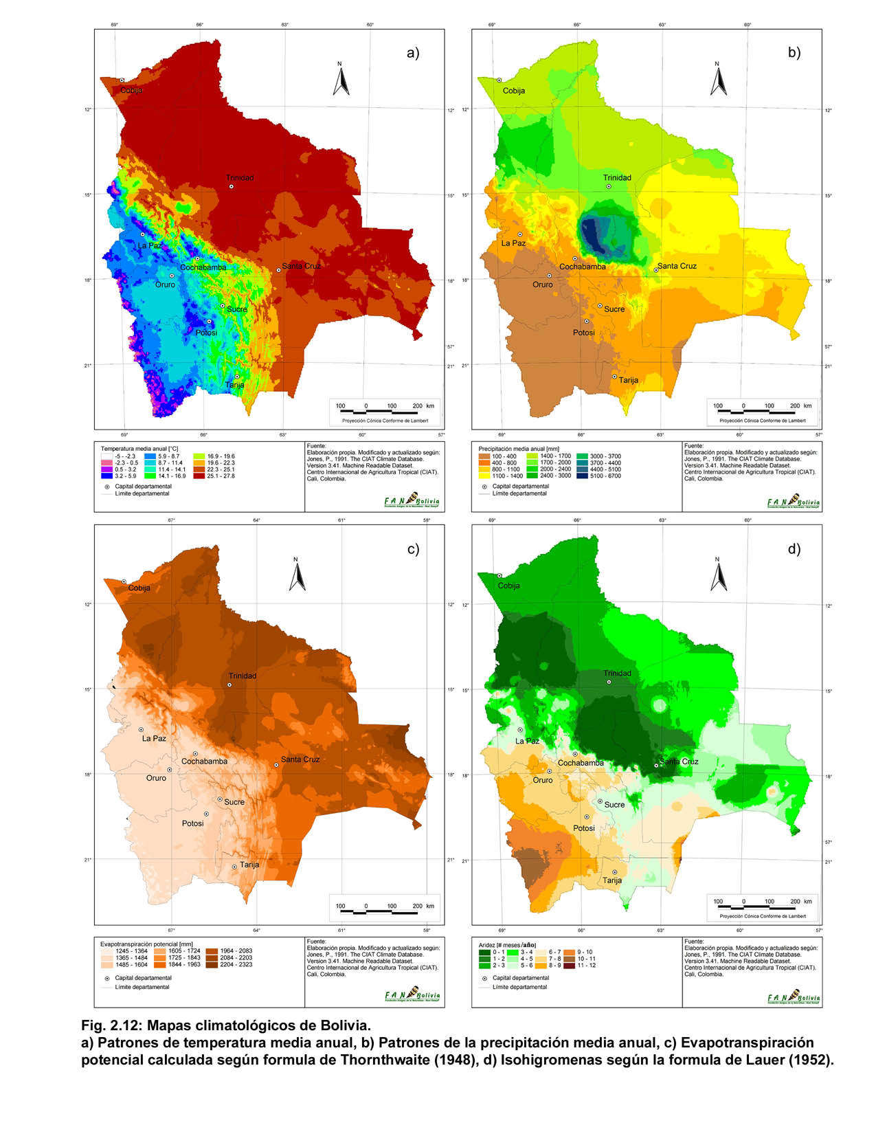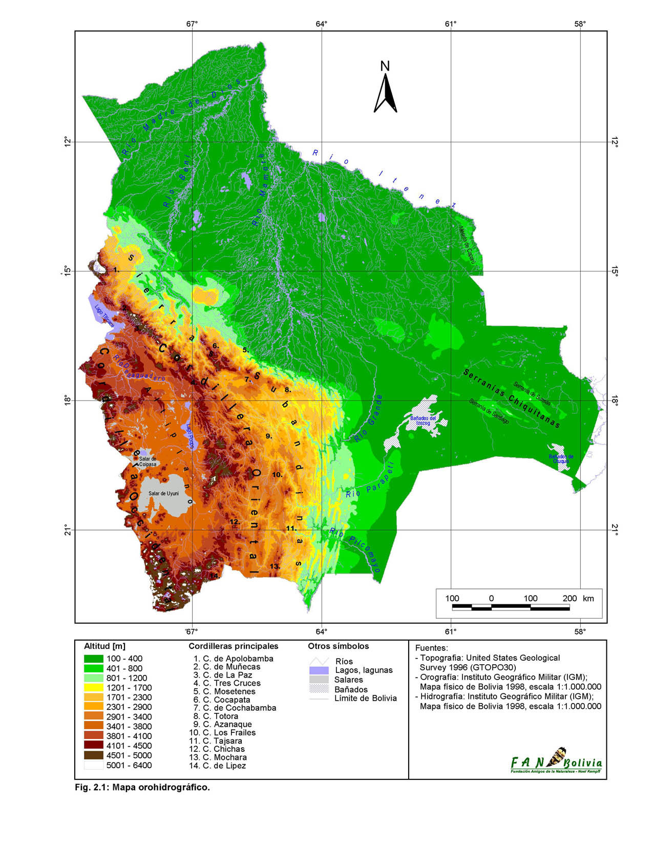 (…) Bolivia carece de costas en el océano. (…) por sus características climáticas, altitudinales y fisiograficas presenta un amplia diversidad biológica resultante de una gran riqueza de ecoregiones y subunidades ecológicas que van desde la zona alto andina hasta la llanura amazónica pasando por los valles secos, los yungas y las serranías chiquitanas, entre otros. Esta amplia variedad de ecorregiones contiene una alta diversidad biológica, considerada entre las mayores a nivel mundial. Hasta ahora se describen más de 40 unidades naturales enmarcadas en variaciones altitudinales muy diversas, que van desde los 6.542 msnm del Nevado Sajama, en la cordillera de los Andes hasta los 70 msnm. cerca del río Paraguay, en las llanuras de las tierras bajas del oriente.