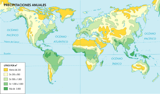 Junto con los mapas de la distribución de estos suelos a nivel mundial, mostramos otros que dan cuenta de aspectos climáticos, con vistas a que podáis analizar las coincidencias que os narramos.  Observar como los suelos salinos y sódicos tienden a aparecer en zonas continentales, es decir lejos del mar. Tal hecho es debido a que las lluvias tienen a descender en intensidad y frecuencia conforme nos alejamos de la influencia marítima. Con esta información y un mapamundi, vosotros mismos identificaréis los países que albergan los tipos de suelos mentados. Hacer el ejercicio y lo veréis.
