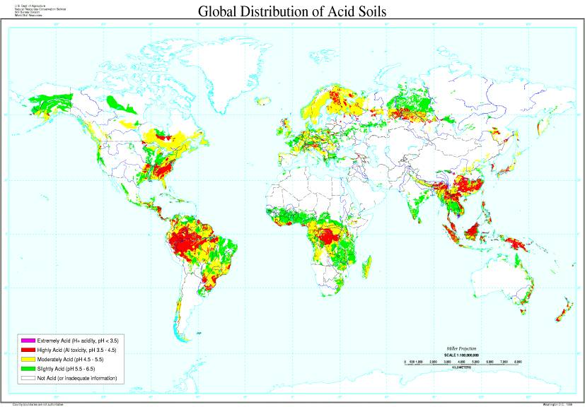 La distribución mundial de los suelos ácidos, obedece a razones diametralmente distintas. Por un lado, la evolución natural de los suelos genera problemas de pérdida de nutrientes y por consiguiente de acidificación. Debido a ello son muy abundantes en las zonas geomorfológicamente muy estables durante millones de años (los denominados crátones en el contexto de la tectónica de placas), siempre y cuando disfrutaran de largos periodos sin déficit de agua. Por estas razones son muy abundantes en los ambientes ecuatoriales húmedos. Los Ferralsoles y Acrisoles pertenecen a este tipo de edafotaxa.