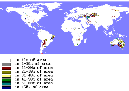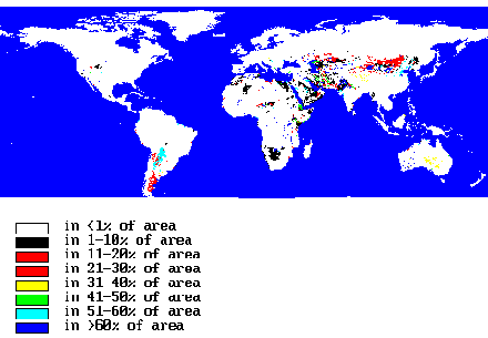 A escala planetaria, los mapas que os vamos a exponer (en su totalidad de la FAO, UNEP, Wikipedia y Wikimedia) demuestran una clara correspondencia entre los suelos salinos y sódicos y los biomas áridos y semiáridos. No obstante, cabe mentar que a escalas más detalladas pueden aparecer en muchos más lugares si las condiciones ambientales del lugar son apropiadas (los denominados factores formadores del suelo). Del mismo modo, la mala gestión del riego en estos ambientes es un factor que induce la expansión de los suelos que sufren alguno de estos problemas, especialmente en los biomas mentados, incluido el mediterráneo. No es infrecuente que cuando se habla de ambientes áridos y semiáridos, algunas personas piensen en zonas calurosos. Sin embargo tal apreciación no es correcta. Ambos se presentan también bajo climas fríos. El problema no estriba en las temperaturas, sino en un déficit acusado de precipitaciones.