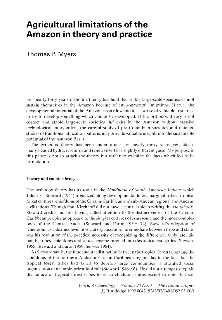 Desde hace muchas décadas, la ortodoxia de la arqueología ha mantenido que tales culturas parecían imposibles por imperativos ecológicos y/o edafológicos. Los suelos de la Cuenca Amazónica son profundos, muy evolucionados y con escasos nutrientes. Si la tecnología moderna no puede implantar cultivos sin degradarlos, ¿Cómo podrían los aborígenes haber desarrollado allí una cultura agraria intensiva? Sin embargo, no todos pensaban así, como hemos visto arriba, y defiende también Thomas P. Myers, entre otros, tal como a continuación expone en la foto de abajo.