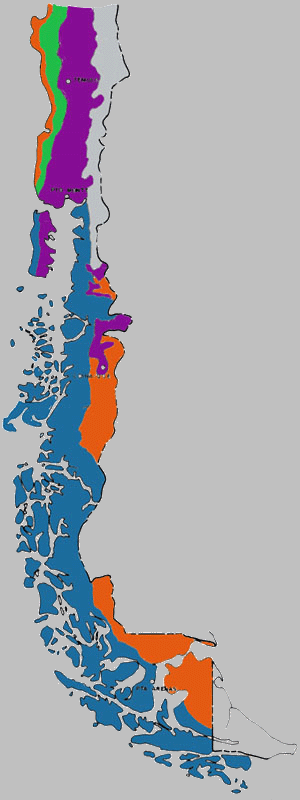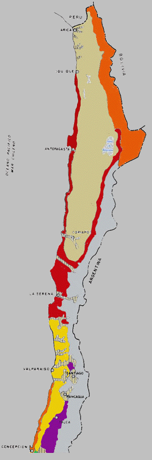 De acuerdo a Walter Lucio, en su artículo on-line de la Biblioteca Digital de la Universidad de Chile, puedes distinguirse las regiones de suelos que exponemos a continuación. He dudado si mezclar ambos documentos. Sin embargo, debido a mi falta de conocimiento del territorio chileno, he optado por presentaros ambas versiones por separado. Digamos antes de empezar que la página Web que alberga este estudio posse un sistema que no permite caracteres de la lengua española como acentos y “ñ”. Por término general tal hecho no genera problemas a la hora de corregir el material. Sin embargo estos surgen en los nombres locales que desafortunadamente desconozco. En consecuencia, pido disculpas a los colegas chilenos por los errores que con toda seguridad he cometido en alguna ocasión.