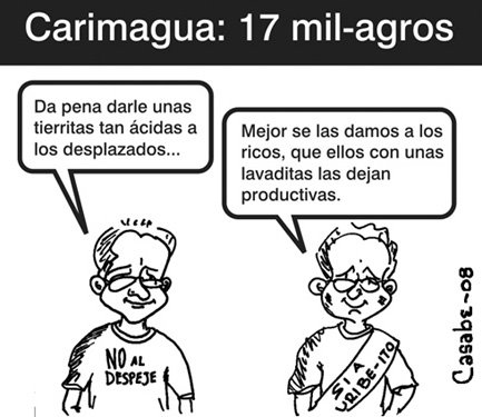 Hay que aprovechar la ocasión para que quienes rechacen con sinceridad aberraciones como la de CARIMAGUA se unan a un movimiento nacional por la derogatoria del Estatuto Rural y otras normas, merced a las cuales se está legitimando y se validarán en el futuro otras por el estilo. Este funesto caso conjuga el despotismo y la mentira con la violación de los principios constitucionales que rigen el desarrollo rural en Colombia y en particular del que prescribe que “es deber del Estado promover el acceso progresivo a la propiedad de la tierra de los trabajadores agrarios” (Constitución Política art. 64) y el derecho de los desplazados a la reparación. En CARIMAGUA hay muchas más perversidades que meros prevaricatos y peculados. Es instaurar la más indignante iniquidad.