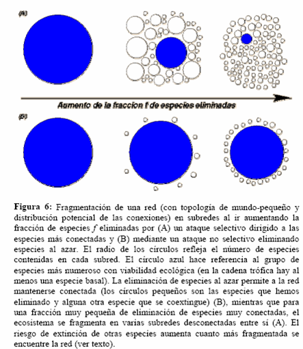 El comportamiento de las tres redes tróficas es muy parecido. Eliminando sucesivamente especies al azar cada red se mantiene conectada, no fragmentándose en subredes. Y, lo que es más relevante, las tasas de extinción tienen valores muy bajos incluso cuando un gran número de especies han sido eliminadas. Algo muy distinto ocurre cuando eliminamos sucesivamente las especies más conectadas: las tasas de extinciones secundarias crecen muy rápido. Por ejemplo, para la red de Silwood Park, la eliminación de algo menos del 10% de las especies más conectadas (13 de las 154 existentes) hace que desaparezcan todas las especies del sistema. Por otro lado, la red se va fragmentando en múltiples subredes desconectadas entre sí (…).