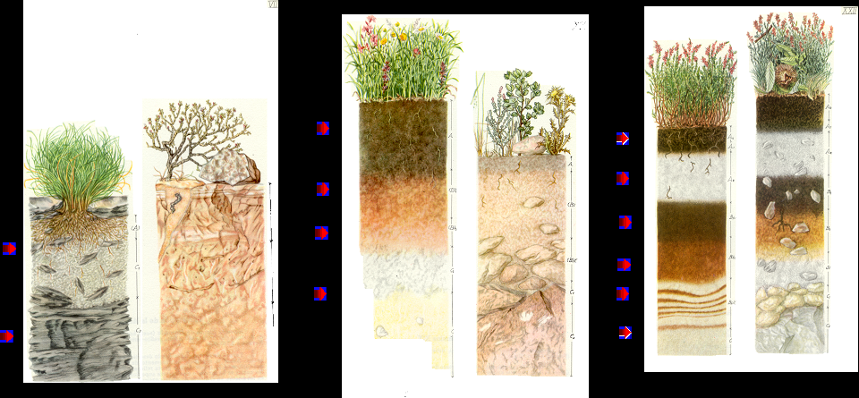 ¿Se mantiene siempre la secuencia de horizontes previamente descrita desde la superficie hasta el material parental? La respuesta obligatoria a esta cuestión debe ser : ¡No!. Se trata de un modelo ideal, pero existen circunstancias muy variadas que dan lugar a excepciones a esta regla. Pongamos un par de ejemplos. Los suelos de las cimas de una ladera pueden erosionarse y transferir sus materiales a los de posiciones más bajas. No es inusual que en ciertas ocasiones un perfil “normal” se encuentre recubierto por los materiales de horizontes generados colina arriba, generando secuencias atípicas en donde un horizonte A, B, o C puede superponerse a otro A del perfil de un suelo ya cerca de la base de la ladera. Del mismo modo, un perfil edáfico puede ser sepultado por una capa de lava, que al enfriarse se transforma en roca. El resultado es que un horizonte R se superpone a un perfil normal. Existen otras muchas combinaciones que podrían citarse. Sin embargo, en ausencia de perturbaciones lo normal es que la secuencia se mantenga, con un mayor o menor número de horizontes.