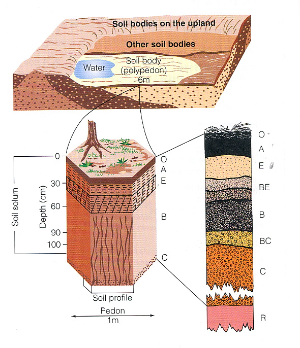 En la práctica, los horizontes orgánicos no “suelen” tenerse en cuenta con vistas a la clasificación de un suelo, como tampoco los R (“en general”), ya que en sentido estricto no forman parte de él. Los últimos son rocas y su estudio concierne a la litología (geología), mientras que los primeros pueden ser muy efímeros, pudiendo cambiar de morfología en pocos años. Más aun, muy a menudo los horizontes E o no aparecen o son difíciles de discernir. Por estas razones, en muchos cursos tan solo se mencionan los Horizontes A, B y C. Una clasificación sencilla de los horizontes orgánicos la podéis encontrar pinchando en este post: “Capas y horizontes orgánicos del perfil edáfico”. Para clasificar correctamente los horizontes R debe utilizarse una clasificación litológica.