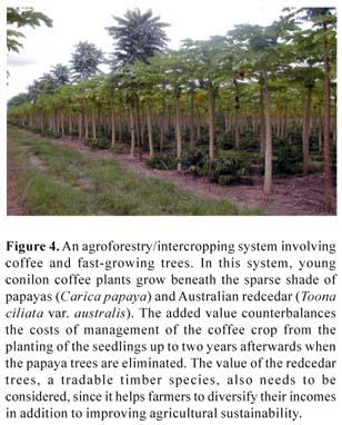 Otra ventaja nada despreciable deriva de que la arboleda actúa como cortavientos, a la par que reduce tanto la evaporación del agua desde el suelo, como la transpiración de las plantas, por lo que son más eficientes en el consumo de agua. Más aun, ayudan a frenar la erosión en laderas pendientes. Ninguna de estas ventajas las atesora los nuevos modelos de producción. Realmente podríamos resumir las ventajas de los modelos industriales no agroforestales, parafraseando el refrán: “un poco más de beneficios económicos hoy, pero hambre asegurada para mañana”. El estudio parece que se llevó a cabo en el sur de México.