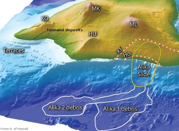 El Tsunami de 1755 en el Algarbe portugués, así como el de lugares más exóticos como el Mauna Loa en Hawai, pueden ayudarnos a entender las variadas causas y efectos relacionados con estos eventos. En el primer caso, los autores señalan que no se produjeron serios procesos de erosión o sedimentación, sino una redistribución del material previamente existente. Para el segundo caso, cuyo origen parece proceder de una enorme avalancha de derrubios de rocas y suelos hacia el mar, tras el colapso de parte del volcán de Muma Loa, la magnitud de tal desprendimiento de los materiales isleños hacia el océano superó los 5.000 km3, generando un tsunami local de enorme margitud. Del mismo modo, se detectaron depósitos sedimentarios cerca del litoral que se encuentran en posiciones que debían elevarse en el momento de la catástrofe a 350 metros sobre el nivel del mar. Un caso parecido se ha detectado en las antillas. Pero también tenemos otros reconocidos de superficies erosivas que cortan a cuchillo depósitos sedimentarios anteriores (dunas) en Túnez, a consecuencia de la erupción del Monte Etna hace unos 8000 años. Del mismo modo, tsunamis asociados a las erupciones en la isla del egeo (mar Mediterráneo) denominada Santorini y que afectaron a las civilizaciones minoicas, han sido estudiados haciendo uso de paleosuelos enterrados (ver enlace en el ñie de figura de la foto correspondiente). Como detalle anecdótico cabe señalar que algunos “aventurados” relacionan estos últimos eventos (al parecer el primero alrededor de hace 3.900 años) con el hundimiento del supuesto continente de las Atlántida.