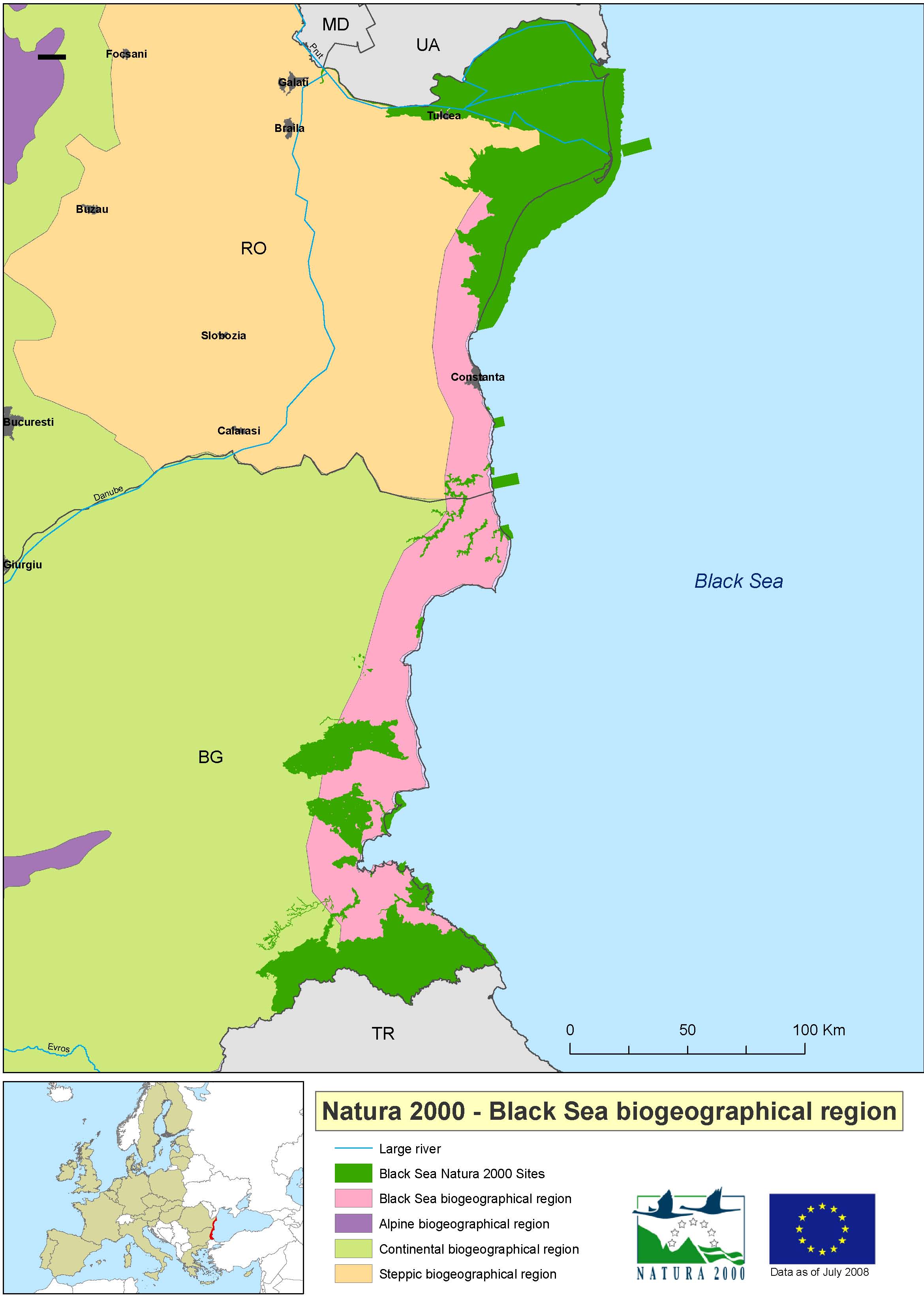 El Mar Negro (del que la región litoral periférica que estudiamos hoy tan solo ocupa una pequeña parte de su línea de costa) es un cuerpo de agua interior, ubicado en la frontera entre Europa y Asia. Comunica con el Mediterráneo a través del Bósforo, mar de Mármara y Dardanelos. Tal mar cuasi-cerrado posee una extensión aproximada de unos 411.500 km², y una profundidad máxima 2.244 m., limitado por las costas de Georgia, Rusia, Ucrania, Rumania, Bulgaria y Turquía. Sin embargo, la Región Biogeográfica reconocida como tal por la EEA tan solo concierne a Rumania y Bulgaria. La salinidad es escasa (aproximadamente la mitad que el mar Mediterráneo), mientras que las aguas profundas son pobres en oxígeno, por lo que la vida no es posible allí a partir de los 200 m. desde la superficie del mar. Una buena parte de las especies que se localizan en esta región son de naturaleza mediterránea y muchas de ellas toleran la salinidad de esta zona.