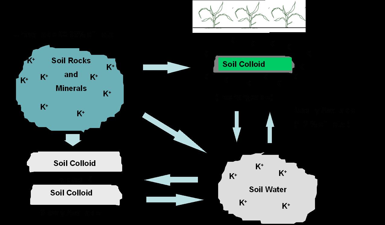 Una vez disuelto el gránulo del fertilizante en el suelo, los nutrientes se incorporan en la dinámica del sistema suelo-cultivo. El K proveniente del fertilizante se ionizan y podrán tener diferentes destinos: consumo por parte del cultivo (solución del suelo), adsorción en arcillas (formando parte de los cationes de cambio). El acceso del K+ al sistema radicular del cultivo es mediante difusión e intercepción radicular. En suelos arenosos es posible también que se presenten movimientos verticales en el perfil y pérdidas por lixiviación. Si se utiliza cloruro o nitrato de potasio, los aniones acompañantes son muy móviles en el perfil y se mueven por flujo masal. Si se utiliza sulfato de potasio, el sulfato también es considerado un anión móvil pero menos que los nitratos.