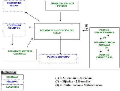 Las entradas de K al sistema suelo-cultivo provienen básicamente de la fertilización. Esto explica la rapidez con la que se pierde la fertilidad potásica en suelos no fertilizados. En cuanto a las pérdidas, la principal vía corresponde a la extracción por parte de los cultivos y de no existir erosión, la otra vía a monitorear es la lixiviación de K+. Este proceso adquiere más relevancia en suelos de texturas gruesas, y está determinado por una serie de factores: ocurrencia de eventos de lluvia o uso de riego, profundidad del sistema radicular de los cultivos, presencia de flujos preferenciales de agua en el perfil, grado de cobertura, dosis de fertilizante, etc. En suelos como los de la Región Pampeana, debido al reducido movimiento de K+ a través del perfil, la lixiviación de K+ tendría escasa relevancia agronómica. En la literatura científica internacional, se mencionan valores máximos de lixiviación de K+ del orden de 15-20 kg/ha/año, cuando se combinan suelos de texturas gruesas y eventos de lluvias o uso de riego.