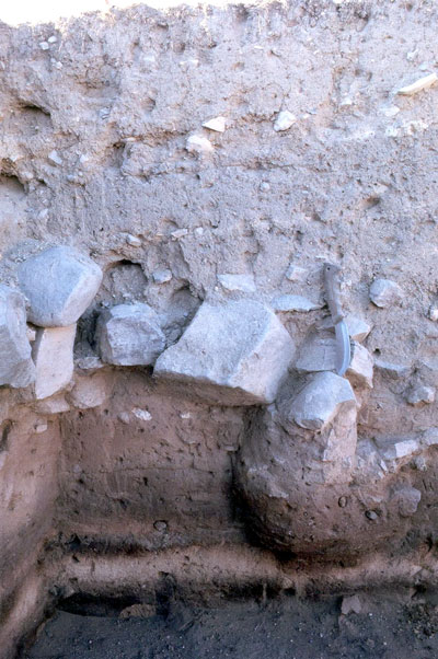 The study of soils at archaeological sites includes two major components; these are the (1) field study of landscapes and description of individual soil profiles and (2) laboratory characterization of soils. The field study comprises a vital aspect for all future interpretations of stratigraphy and ultimately the environmental history of the site. Field soil morphology includes detailed evaluation of soil horizons that provide descriptions of soil texture, structure, color, consistence, horizon boundaries and classification. Figure 1 shows a soil profile (cross section of soil) in Field A at al-Mudaybi’; note the alternating dark and light-colored bands in the lower portion of the profile. The dark layers are periods of stability when organic matter was accumulating in the soil from plant decomposition, and light-colored zones are areas of rapid deposition of wind-blown sediment. Many archaeological sites are in a dynamic position on the landscape, such as along rivers and streams, base of colluvial slopes, or in areas of eolian (wind) deposition. Loess deposits (Figure 2) were the dominant parent material for soils on the Karak Plateau, although a wide range of loess thickness occurs on the various landscapes.