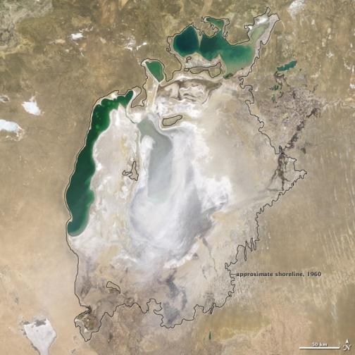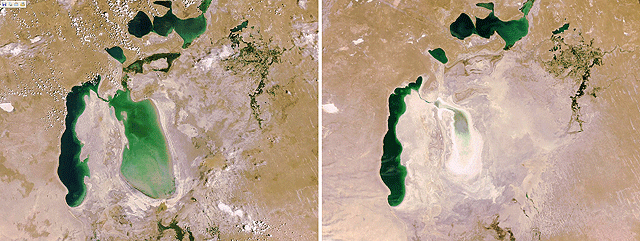 El satélite Envisat ha mandado unas dramáticas imágenes del mar de Aral, situado en Asia Central, entre Kazajistán y Uzbekistán. Si hace tres años ya se notaba una gran disminución en su tamaño, el que fuera uno de los cuatro mares más grandes de la Tierra, ha pasado a ser poco más que varios lagos dispersos.