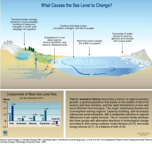 iii. La subida del nivel del mar depende de la expansión térmica del agua al calentarse, así como del deshielo de glaciares de montaña y casquetes polares. El IPCC creyó que la repercusión del último proceso mentado sería despreciable y ahora resulta que diversos investigadores demuestran que no será así.