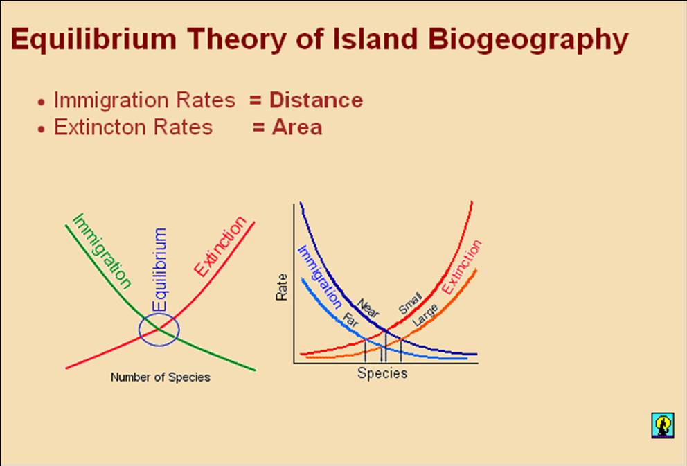 La teoría de la biogeografía insular [Theory of Island Biogeography] propuesta por MacArthur y Wilson entre 1963 y 1967, parte de la premisa de que el número de especies que residen en una isla (o en un hábitat aislado) es el producto del equilibrio entre las tasas de extinción y migración de especies que ocurren en ella. El objetivo de la teoría consiste en explicar la dependencia del número de especies respecto a aquellos factores ambientales que lo condicionan (p. ej. el área, la proximidad y magnitud de las áreas fuentes de donde proceden las especies, que en el caso de un sistema insular podría ser la distancia al continente más cercano.