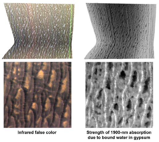 Como en la Tierra, los campos de dunas ricos en yeso aparentemente son poco frecuentes en Marte. Estos han sido identificados exclusivamente en el lugar denominado “Olympia Dune Undae” que rodea una parte del casquete de hielo polar residual del norte de la superficie marciana. Análogas a las dunas de yeso terrestres, el yeso de los cordones de arena de “Undae Olimpia” podrían tener su origen en el transporte y deposición eólicas. En este modelo, los sedimentos ricos en este mineral podrían haber sido formadas por las aguas subterráneas confinadas o superficiales y posteriormente transportados por el viento. Cualquier precipitación de yeso posterior en el área de origen podría haber sido iniciada por la fusión episódica de la capa de hielo polar de Marte. Probablemente el yeso se depositó en las dunas “Undae Olimpia” tras la deflación de los acontecimientos principales que llevaron a la formación de los componentes de siliciclástico del campo de dunas.