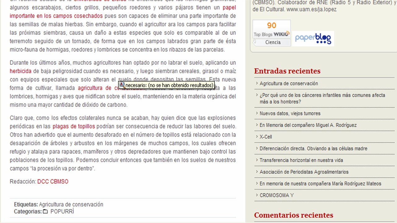 El 26 de marzo de 2010, en un blog vecino, su administrador escribía sobre agricultura de conservación, biodiversidad del suelo, etc. Y me sorprendió mucho, por cuanto se trata de una bitácora que versa sobre biotecnología. Comencé a leer intrigado el post hasta que me di cuenta de lo que proponía su autor. Primero analizaremos las bases sobre lo que “dice” versar este tipo de gestión agraria, aparentemente amigable, para separar después el grano de la paja. Finalmente, os mostraré todo lo que personalmente considero que no debería hacer un blogger científico, claro que no es la primera vez, ni mucho menos.