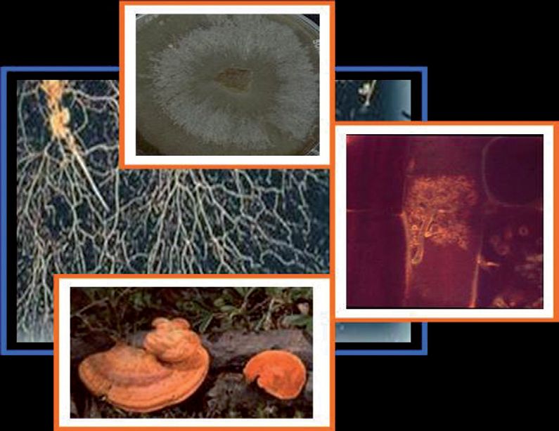 Los hongos micorrizas viven en una relación simbiótica con plantas. Los hongos alargan el alcance de las plantas absorbiendo nutrientes y agua que de otra manera serán fuera del alcance de las raíces de las plantas. A cambio, los hongos se alimentan de las fuentes de carbono provistas por las plantas.