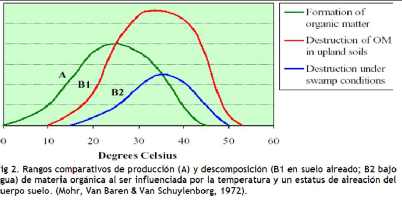 La figura 2 indica que un aumento de materia orgánica puede tener lugar en regiones frías y templadas y bajo condiciones pantanosas aún en zonas tropicales. Los materiales de suelo orgánico que se forman en ambientes diferentes son por lo general de composición botánica diferente, los grados de descomposición y contenido de agregados minerales son igualmente variados.