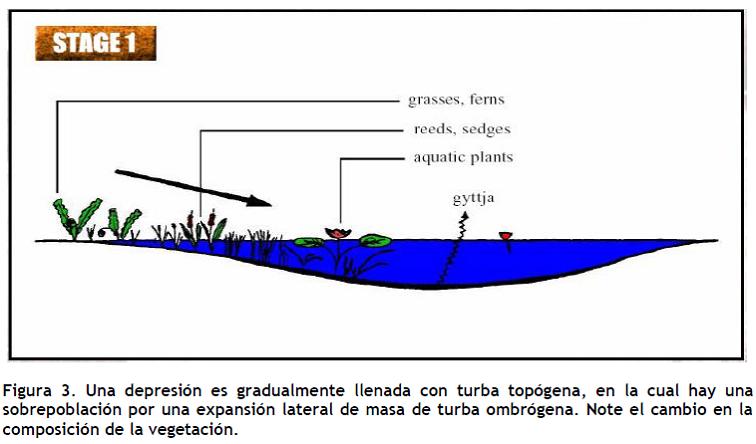 Las áreas centrales de cuerpos de turba topógena vírgenes y formaciones ombrógenas en tierras bajas están muy cerca de encontrarse saturadas con agua casi estánnica (estancada). Las áreas de bordes de los extensos pantanos elevados tienen un régimen de agua menos monótono, con áreas más secas, cercanas a depresiones naturales que conducen a un drenaje por gravedad de los alrededores inmediatos. Lo opuesto parece ser realidad para domos pequeños donde el régimen de agua es menos taponado. El drenaje radial de tales domos resulta en flujos ocasionales cercanos a los márgenes, mientras el centro puede estar a veces, completamente seco en la superficie.
