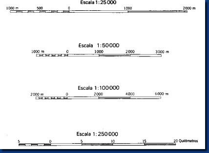 Escala gráfica: Representa lo mismo que la numérica, pero lo hace mediante una línea recta o regla graduada. Colocando la escala sobre el mapa, puede calcularse la distancia real existente entre dos puntos. En la escala de abajo, la longitud total de la línea segmentada es 200 Km, en tanto que cada fracción de la misma puesta sobre el mapa equivale a 50 Km en la realidad.