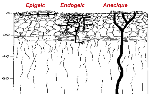 (2) Las especies endogeas viven a mayor profundidad en el perfil del suelo, y se alimentan principalmente de suelo y de la materia orgánica asociada. Tienen poca pigmentación, y construyen sistemas de galerías horizontales muy ramificadas, que llenan con sus propias deyecciones mientras se mueven por el horizonte orgánico-mineral del suelo. A diferencia de las lombrices epigeas, las especies endogeas presentan tasas de reproducción más bajas y ciclos de vida más largos, y son más resistentes a períodos de ausencia de alimento. Las especies anécicas viven de forma más o menos permanente en galerías verticales, que pueden extenderse varios metros hacia el interior del perfil del suelo. Por las noches emergen a la superficie para alimentarse de hojarasca, heces y materia orgánica en descomposición, que transportan al fondo de sus galerías; depositan sus excrementos en la superficie. Normalmente estas lombrices son grandes y de color pardo oscuro. Sus tasas reproductivas son relativamente bajas.