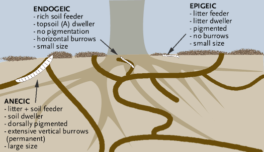 (1) Los tres principales grupos de acuerdo a las estrategias de vida son: Epigeas, anecicas y endogeicas. Las epigeas se alimentan de restos de plantas, que están sobre la superficie del suelo o dentro de las capas de restos vegetales, raramente forman madrigueras, tienden a ser completamente pigmentadas, y son de tamaño pequeño a mediano; las anecicas se alimentan de restos de plantas y suelo, viven en madrigueras verticales, son dorsalmente pigmentadas y de gran tamaño. Las especies endogeicas son comedoras de suelo, no son muy pigmentadas, forman amplios sistemas de madrigueras horizontales y pueden ser pequeñas o grandes.