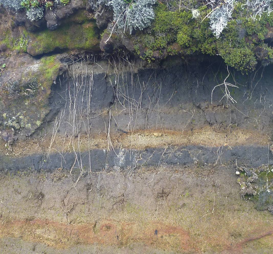 Capas sucesivas de cenizas volcánicas que entierran Andosoles incipientes. Nevado del Ruiz, Colombia. Fuente Juan José Ibáñez