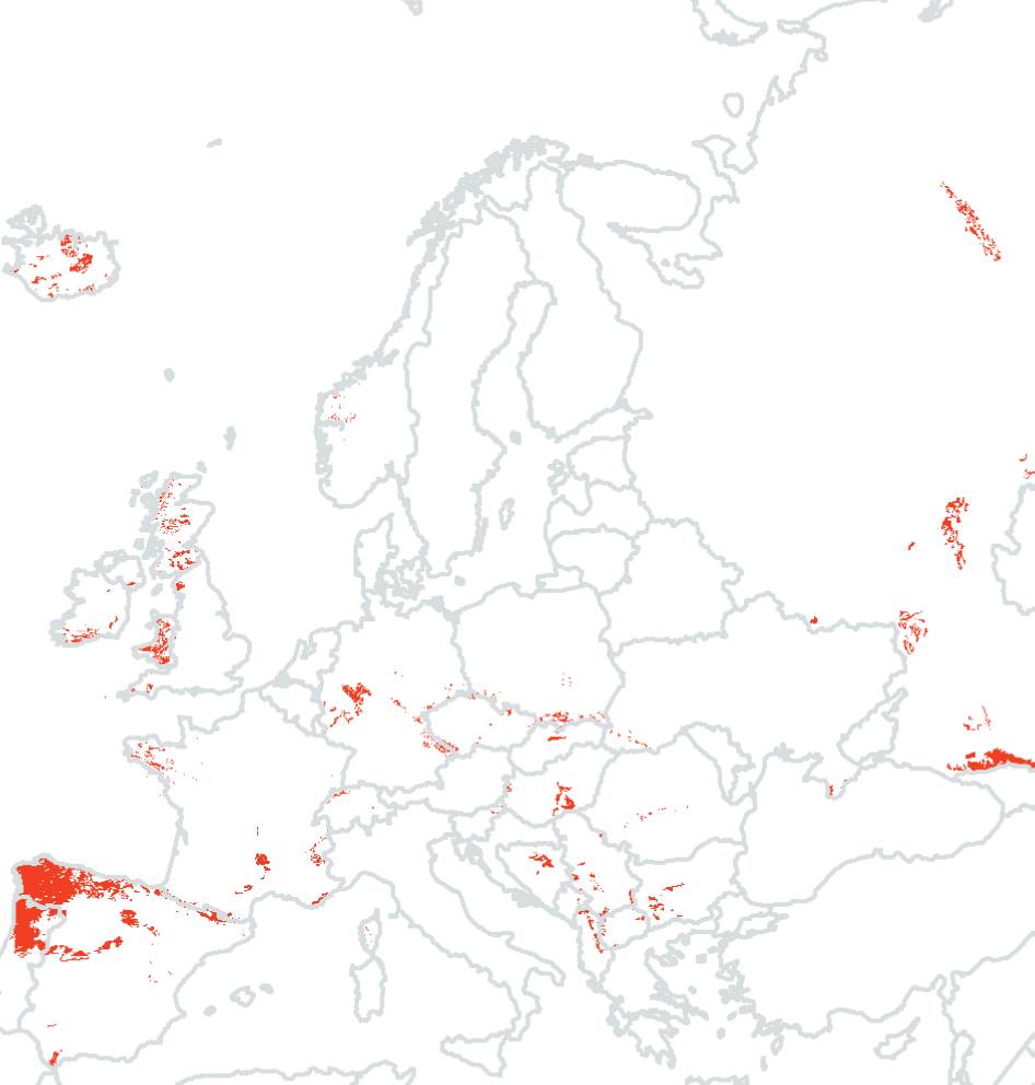 Umbrisoles en Europa según: Bob Jones, John Hollis y Luca Montanarella., 2003. Experiences with WRB: 1:1,000,000 scale Soil Map for Europe European Summer School on Soil Survey (ESB).