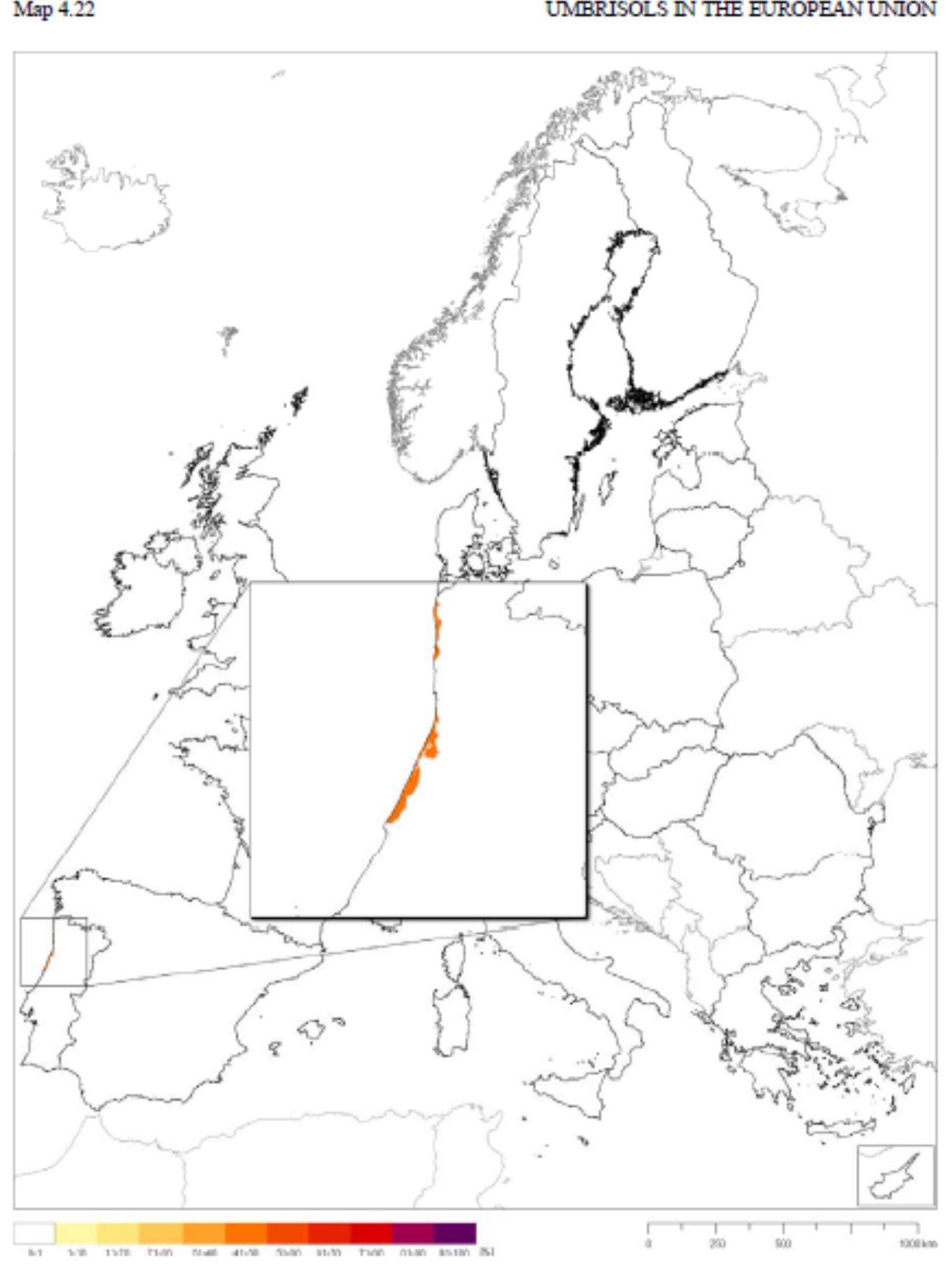 Los Umbrisoles son suelos órgano-minerales jóvenes, típicos de biomas templados, o en términos generales, de ambientes frescos y húmedos en otros biomas (a menudo en regiones montañosas). En principio, se trata del Grupo de Suelos de Referencia de la WRB que ocupa una menor extensión en la Unión Europea (UE). No bastante, cabe señalar que se trata de un taxa nuevo que surgió con la WRB de 1998, por lo que la adscripción de los abtiguos tipos de suelos de la Leyenda de la FAO a este nuevo Grupo de Suelos de Referencia se realizó inicialmente con bastantes incertidumbres, como expondremos seguidamente. A nivel de la UE, los Umbrisoles tan solo “parecían” cubrir, en la primera base de datos de suelos del European Soil Buro (ESB) alrededor de 329 km2, es decir el 0.01% de la edafosfera de esta mancomunidad de países. Sin embargo, nuevos datos ofrecen coberturas bastante superiores. En primera instancia, aparecía como un suelo endémico circunscrito al norte de Portugal y, asociado a Cambisoles, como se muestra en una de las tres figuras que hoy presentamos. Sin embargo, datos más recientes del ESB demuestra que también se ubica en otras regiones y especialmente en Galicia, ampliando la frontera previamente circunscrita al norte de Portugal. Personalmente tenía constancia de que también aparecían en tierras gallegas por estudios previos en los que se les denominaba, por su singularidad, Ranker atlántico. Por lo tanto, el texto del que hemos partido, con vistas a elaborar los restantes post sobre este edafotaxa de la WRB de Europa (Soils of the European Union), no resulta de mucha utilidad. Información más actualizada aparece en el Atlas de Los Suelos de Europa de Libre Acceso en Internet como se puede observar en otro de los mapas que os mostramos. Por lo tanto, aun sin poder aportar cifras seguras sobre su extensión, si podemos inferir que se trata de un taxa bastante ubicuo asociado principalmente a las regiones biogeográficas de climas húmedos y frescos, sin déficits hídricos (Templada, Boreal, Atlántica, Continental y Macarronésica de montaña). En la mencionada base de datos de la Unión Europea, solo se detectó únicamente un subtipo concreto: los Umbrisoles arénicos restringido a los ya aludidos 329 km2 de Portugal. Sin embargo, en la explotación que personalmente realizamos para todo el continente (no solo la UE), también se presentaban los Umbrisoles gleicos, en mayor proporxión que los arénicos. Los Umbrisoles suelen formarse sobre rocas silíceas y sus materiales de alteración (depósitos pleistocenos y holocenos). A nivel global los Umbrisoles ocupan un millón de Km2. Se trata de suelos relativamente profundos y generalmente bien drenados, oscuros, muy ricos en materia orgánica y e reacción ácida (pH bajo y pobres en nutrientes). En muchas circunstancias, la formación de este edafotaxa ocurre en un periodo de tiempo relativamente breve, mostrando ocasionalmente rasgos incipientes propios de los horizontes espódicos o árgicos, que en ningún caso se expresan lo suficiente como para ser considerados como tales. Un incipiente horizonte cámbico si puede aparecer. Su principal característica es la presencia de el horizonte órgano-mineral Úmbrico, cuyas propiedades hemos mencionado con anterioridad. Suelen asociarse a superficies geomorfológicamente jóvenes.