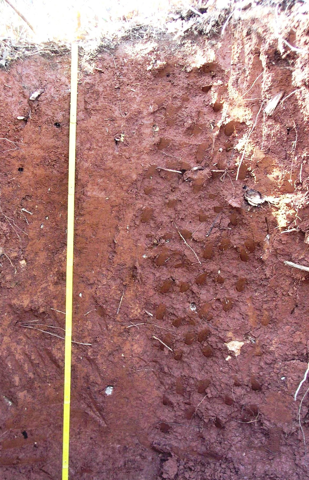 Para la elaboración de este post, junto a la información habitual que hemos utilizado hasta la fecha, os transcribimos buena parte de los contenidos en el Calendario 2012 “Los suelos de América Latina y el Caribe”, elaborado por el Buró Europeo de suelos. Agradecemos a Luca Montanerella (su Secretario General) el consentimiento para reproducir aquí esta información. Los Nitisoles son suelos rojos tropicales profundos, bien drenados y con un horizonte subsuperficial arcilloso nítico que tiene elementos estructurales de bordes planos o nuciformes con caras brillantes, de ahí su nombre. Los Nitisoles son producto de la meteorización intensa de rocas parentales intermedias a básicas (como basaltos o rocas calcáreas), en algunas regiones con adiciones recientes de cenizas volcánicas. Resultan suelos ricos en arcilla, (como caolinita o/ (meta) haloisita) y en óxidos e hidróxidos de hierro y aluminio. El color rojo nos indica la presencia de cantidades importantes de óxidos de hierro y la ausencia de carbonatos, que han sido lavados del suelo. Nótese la falta de límites claros entre horizontes y los característicos elementos en forma de nuez. Los Nitisoles son más productivos que otros suelos tropicales, debido a la mayor concentración de materia orgánica y a la retención de agua para las raíces de las plantas. Los Nitisoles predominan en tierras llanas, aunque se encuentran también en elevaciones. Se desarrollan preferentemente bajo bosque lluvioso tropical o vegetación de sabana. El mapa muestra la ubicación de las zonas donde los Nitisoles son más abundantes y dominantes: poco más del 1% de la superficie de Latinoamérica (ocupa la posición undécima por su abundancia dentro de los grupos de suelos de referencia de la FAO en este territorio). En la región aparecen bien representados en Honduras, Nicaragua, Costa Rica, Panamá, Guatemala y Brasil. Es decir este grupo de suelos de referencia de la WRB resulta ser especialmente abundante en Mesoamérica o América Central.